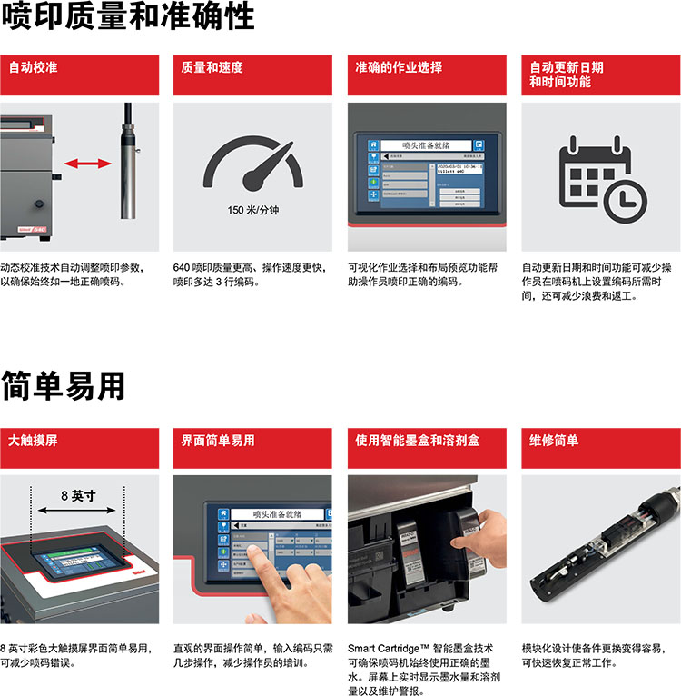 8英寸大觸摸屏界面簡單易用,可減少噴碼錯誤。Smart Cartridge?智能墨盒技術(shù)可確保噴碼機(jī)始終使用正確的墨水。